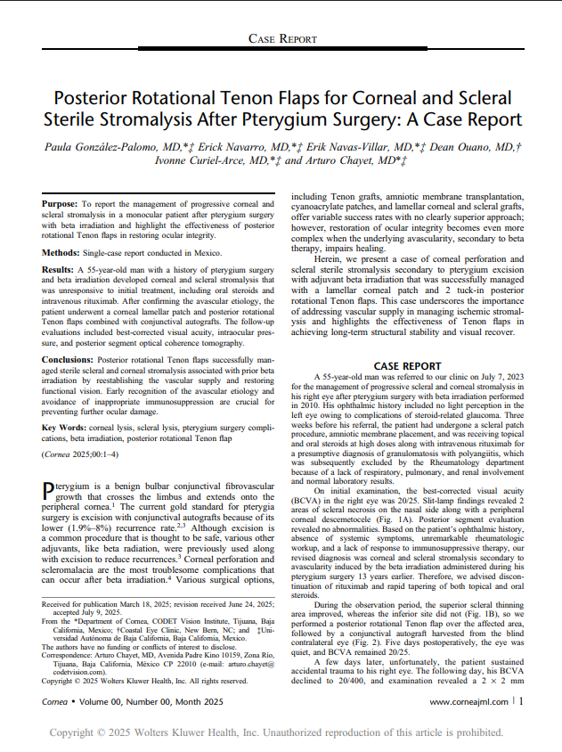 This case report—“Posterior Rotational Tenon Flaps for Corneal and Scleral Sterile Stromalysis After Pterygium Surgery”—was published by our team of Cornea Fellows under the mentorship of Dr. Arturo Chayet, founder and Medical Director at CODET, and Dr. Erik Navas, Director of the Cornea Service.